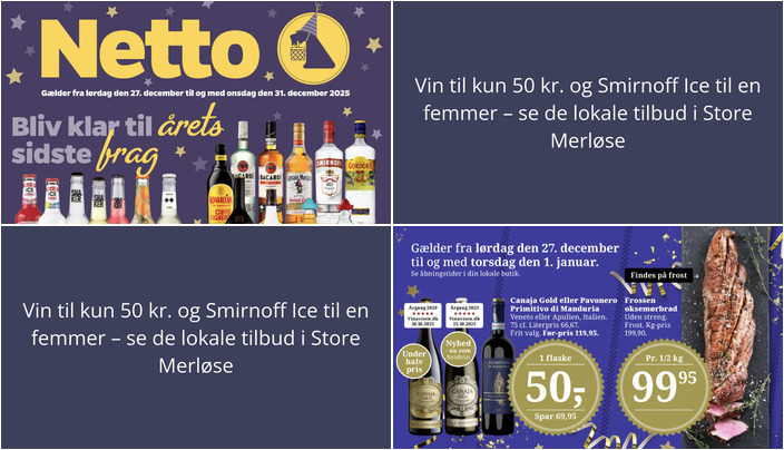 Netto har et skarpt tilbud på Smirnoff Ice, Shaker eller Mokai. Du kan få en flaske på 27,5 cl for kun 5 kr. Dog er der en begrænsning på 24 stk. pr. variant pr. kunde pr. dag til denne pris. Tilbuddet gælder fra lørdag den 27. december til onsdag den 31. december.